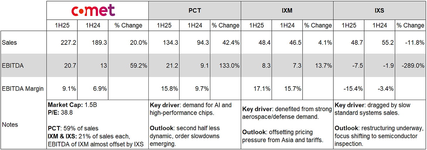 I know you raised an eyebrow when you saw that EBITDA % change. Yes, Comet got hammered in this segment, but I don’t think it’s as bad as it looks. This slump is largely the result of the current restructuring program, where Comet is deliberately shifting focus and resources toward semiconductor inspection. Management doubled down on this plan in last month’s earnings report, with CEO Stephan Haferl saying the underperforming X-ray division IXS will be reoriented in the second half of the year to adapt to current market conditions: