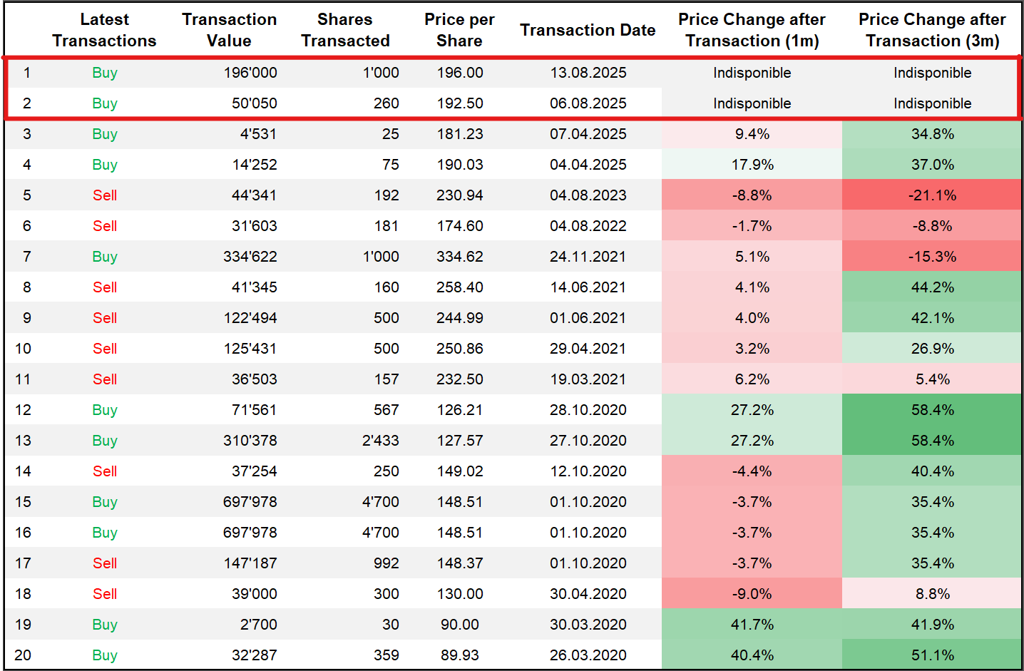 Insiders know something: In ALL of their past group purchases, insider buying has marked a local bottom in Comet’s share price. If history repeats, we could be looking at the same pattern here, with the potential for the ~44% average return we’ve seen before. That would put the stock around CHF 280.