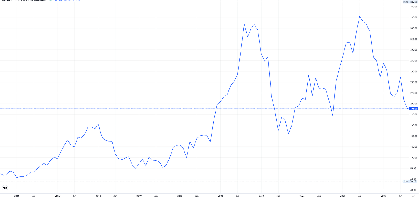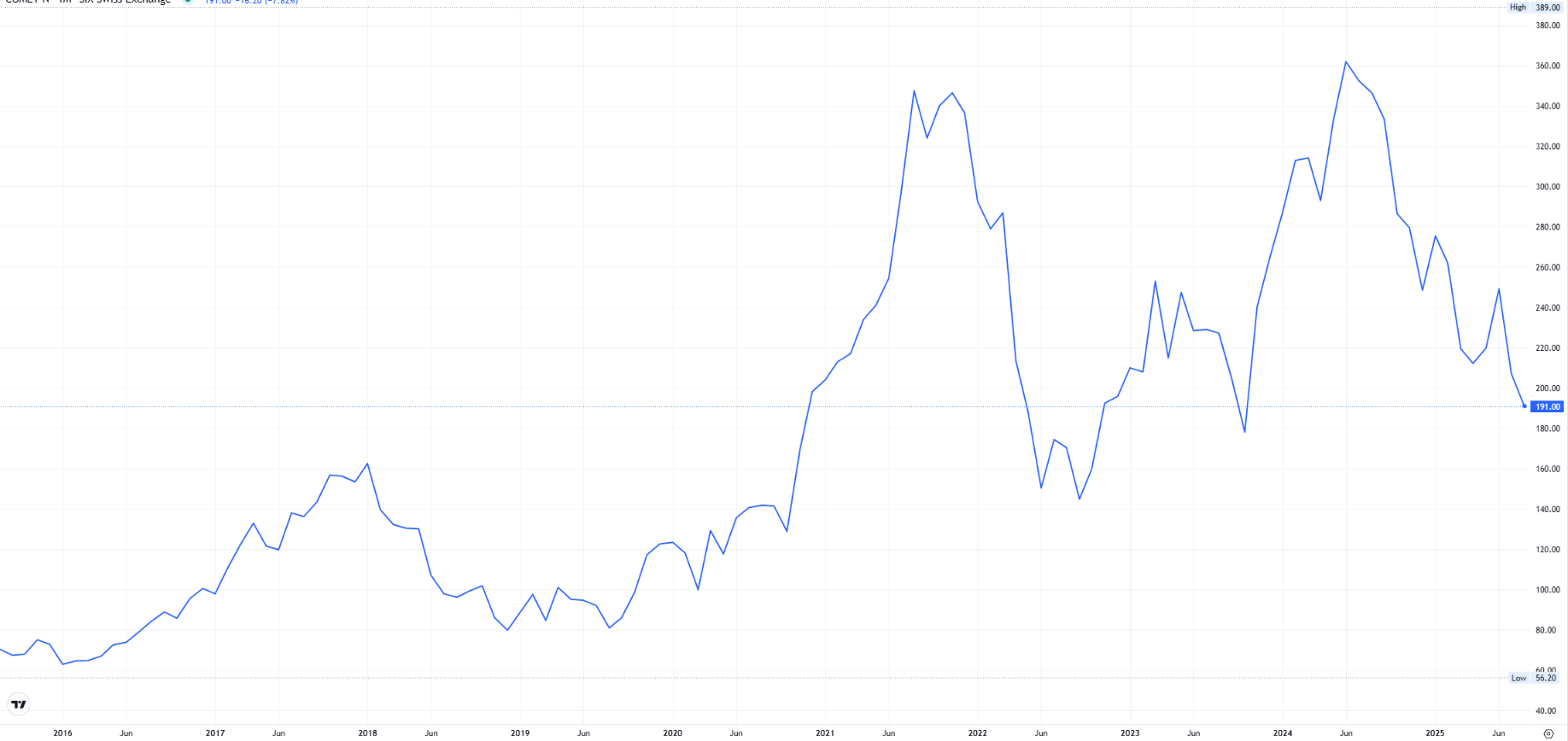 Insider signal fails: Even if history is on our side, insider buys are never a sure thing. This year’s purchases could be random, or management might have underestimated the macro headwinds hitting Comet. If that’s the case (or if any of the following risks play out) remember that the five-year low sits at CHF 144, about -25% below today’s price.